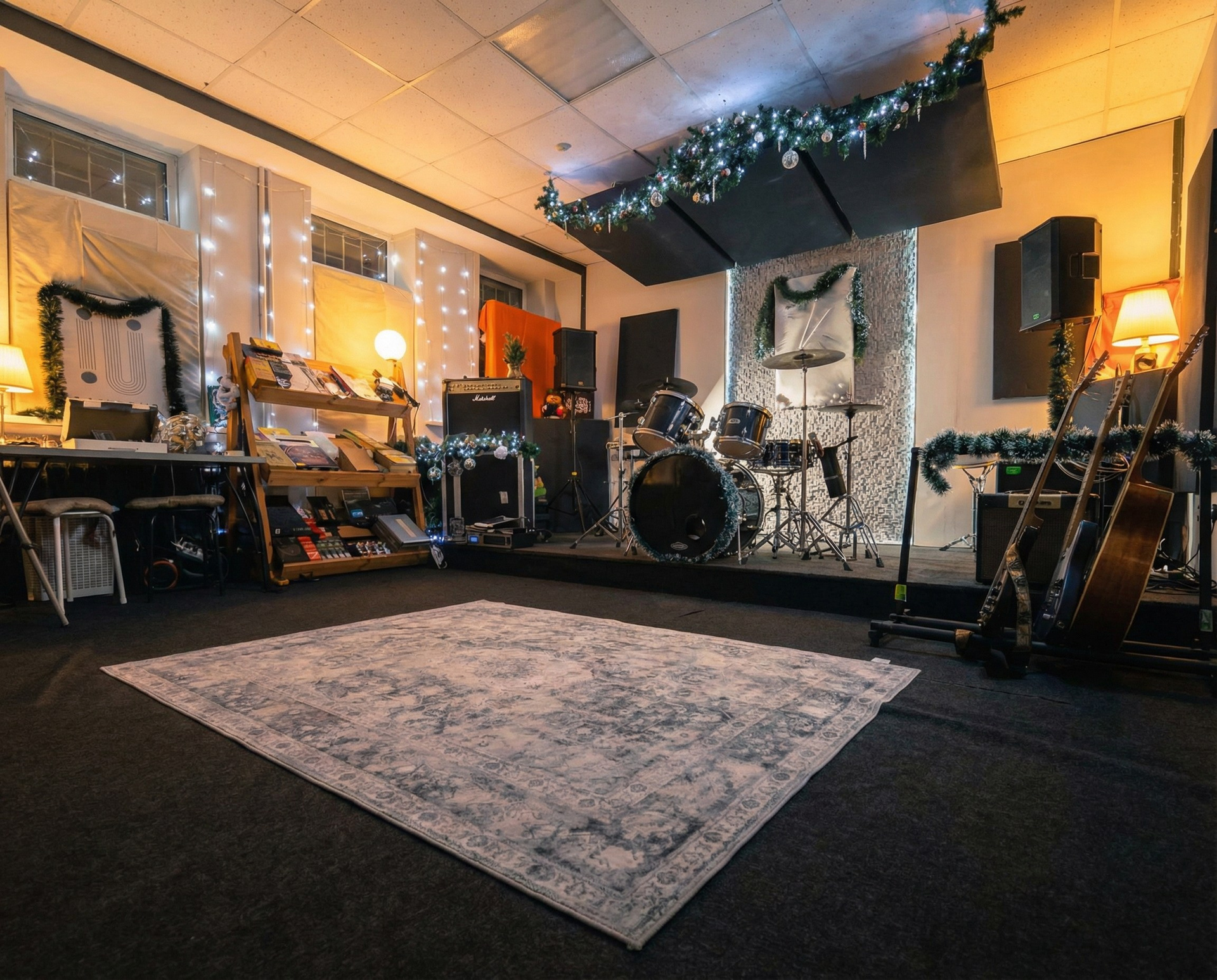 - Занятие в оборудованном кабинете (стойки, микрофоны, пюпитр, клавиши, магнитная доска, удобные стулья и атмосфера)