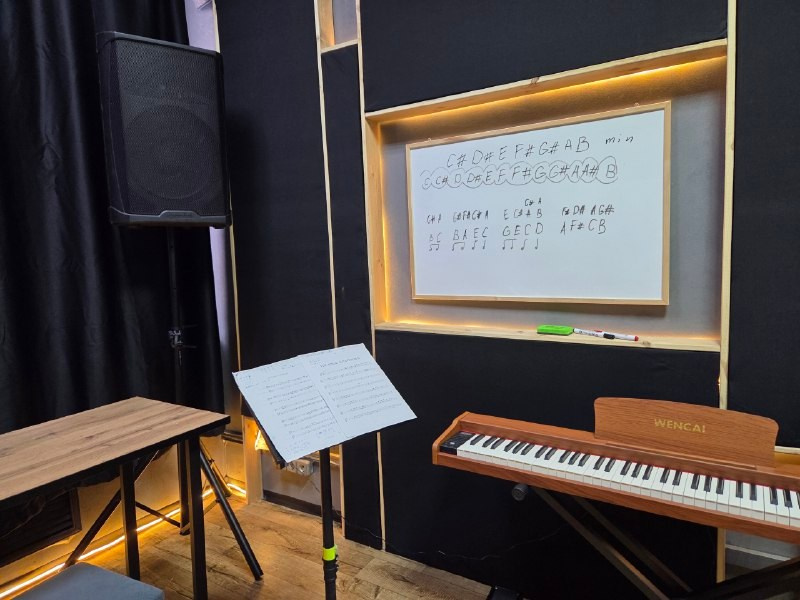 - Занятие в оборудованном кабинете (стойки, микрофоны, пюпитр, клавиши, магнитная доска, удобные стулья и атмосфера)